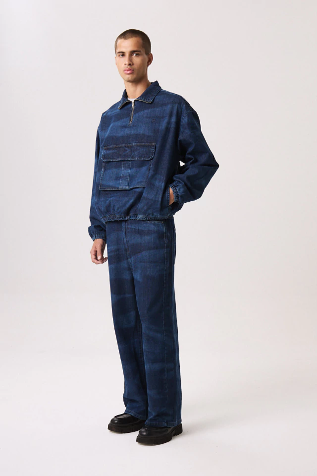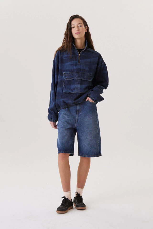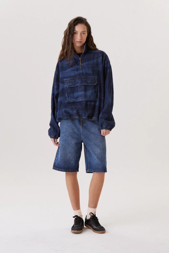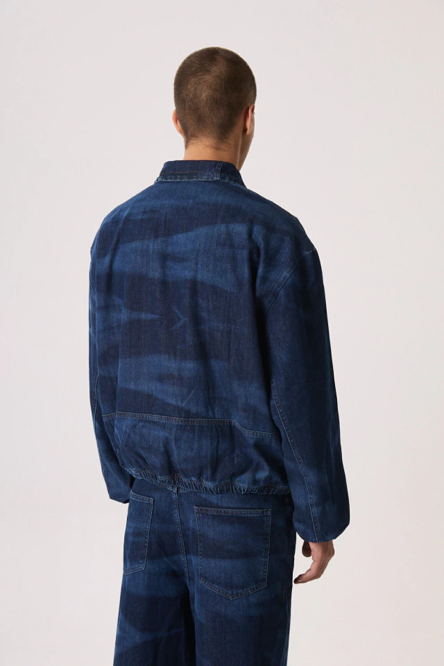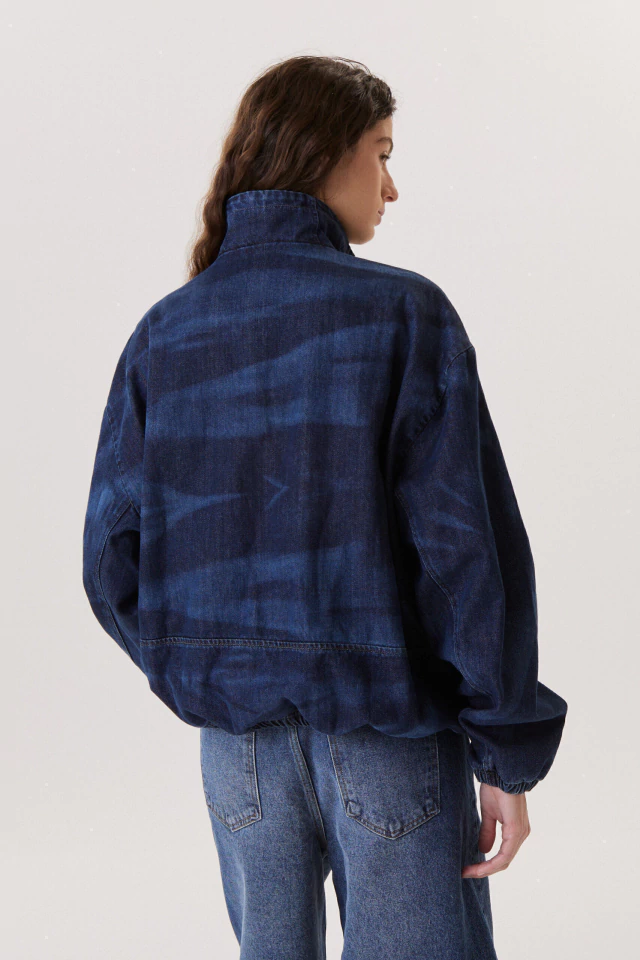 Anorak de denim, color azul con lavado laser. Calce amplio y relajado. Largo a segunda cadera. Bolsillo en delantero. Cintura y puños elasticos. Cierre frontal. Sin gènero. Arma tu total look con el Jean Wes Huella. Composiciòn: 100 algodòn. Cuidados: Lavar a maquina max. 30ºC. Centrifugado corto. No usar blanqueador. Planchar maximo 110ºC