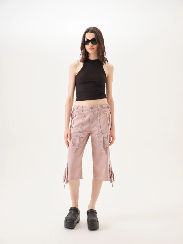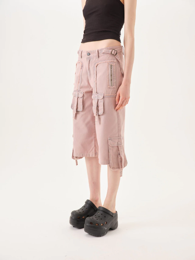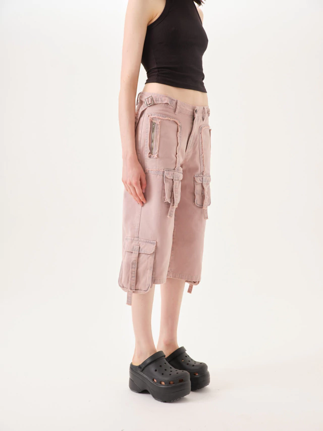 Tiro medio, rosa con lavado efecto acido. Largo por debajo de rodillas, silueta amplia y relajada. Bolsillos cargo en ambas piernas. Cierre frontal y avíos metálicos. Lazo con hebillas en cintura.Composiciòn: 100 algodòn. Cuidados: Lavar en lavarropas, no usar blanqueador, centrifugado corto. Calce sin genero.