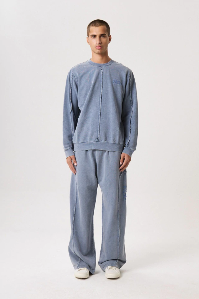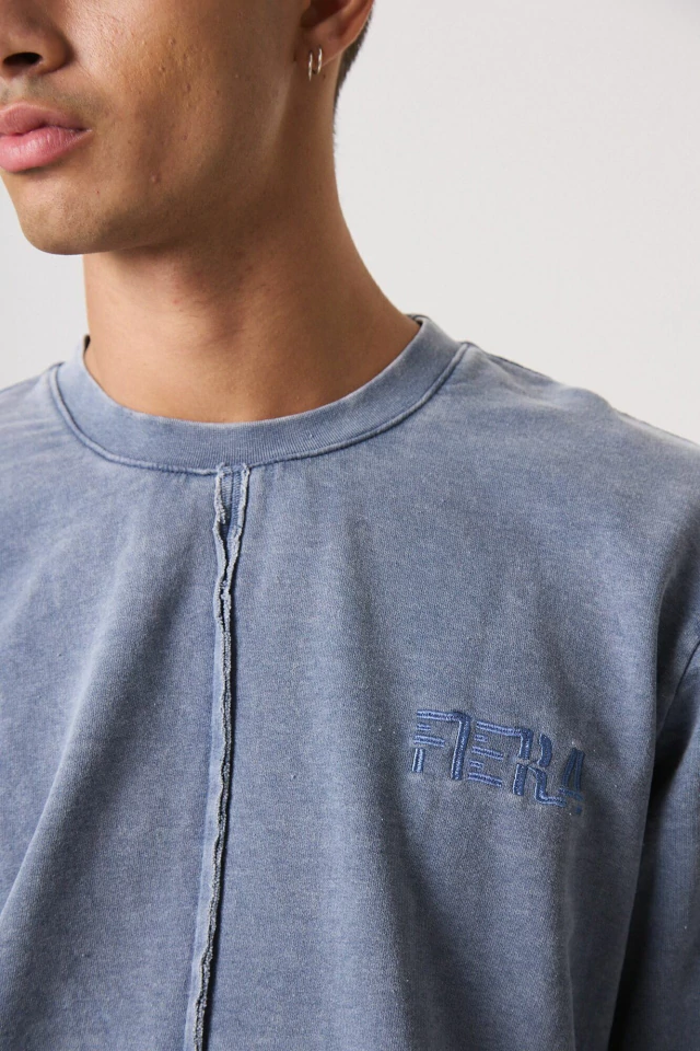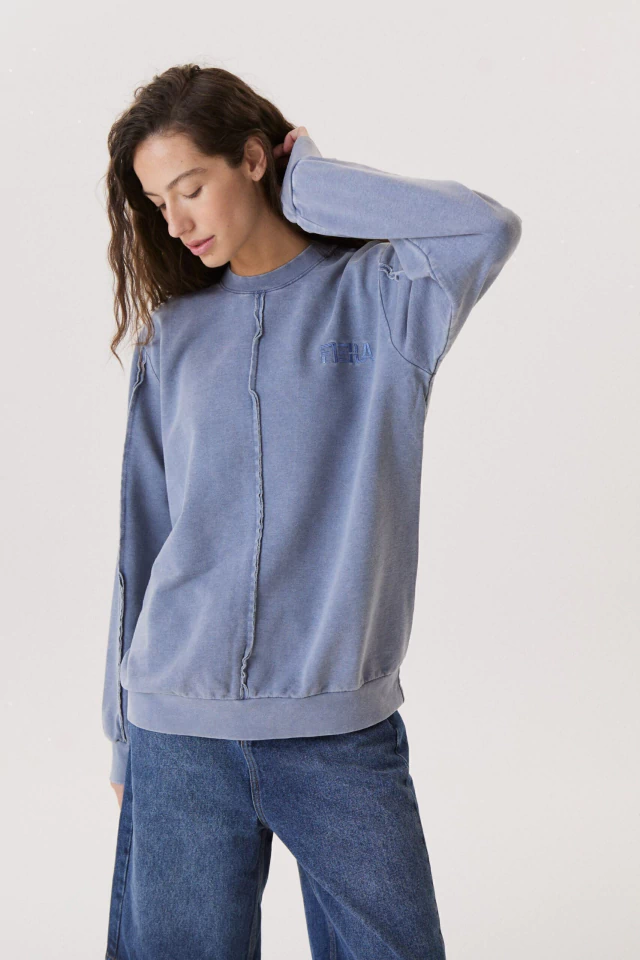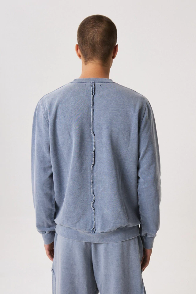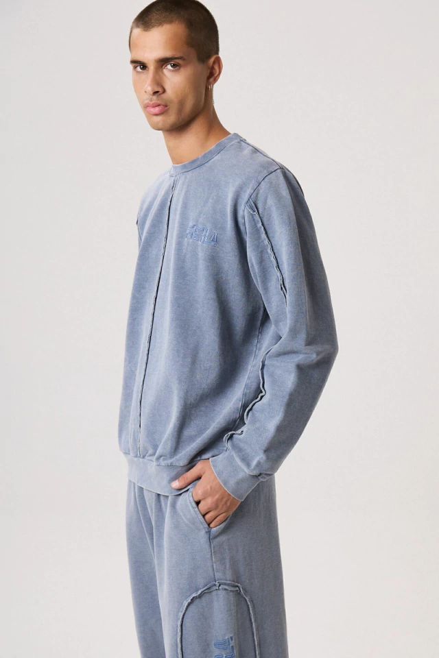 Buzo de rústico escote redondo, teñido acid en color azul. Largo a segunda cadera y silueta amplia. Recortes en delantero, espalda y mangas. Bordado en delantero.