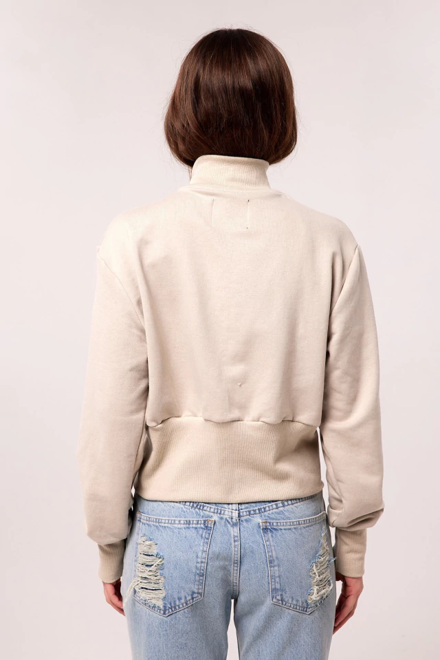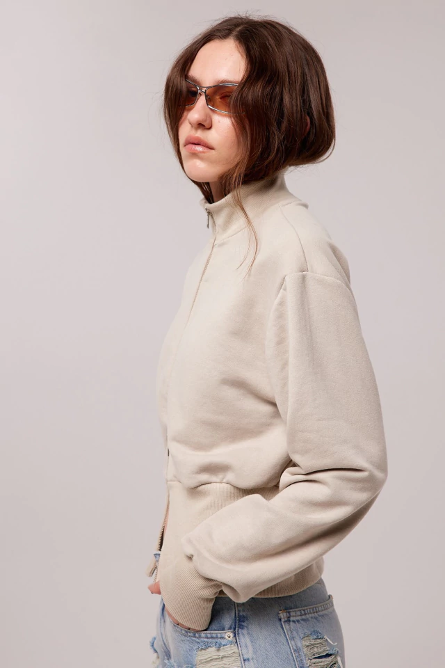 Buzo de rústico color arena. Calce al cuerpo, cuello alto. Ribb en puños de manga, cintura y cuello. Largo a primera cadera. Cierre doble recorrido metalico. Composición: 80% algodón 20 % poliester. Cuidados: Lavar a mano con agua fria. No Centrifugar. No usar blanqueador. Planchar maximo 110ºC. Las medidas de la modelo son: Busto 82cm, Cintura 60cm, Cadera 90cm, Altura 1.75mt. Está usando talle S.
