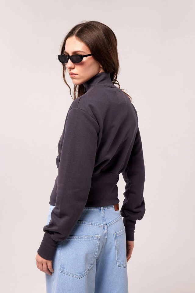 Buzo de rústico color gris. Calce al cuerpo, cuello alto. Ribb en puños de manga, cintura y cuello. Largo a primera cadera. Cierre doble recorrido metalico. Composición: 80% algodón 20 % poliester. Cuidados: Lavar a mano con agua fria. No Centrifugar. No usar blanqueador. Planchar maximo 110ºC.