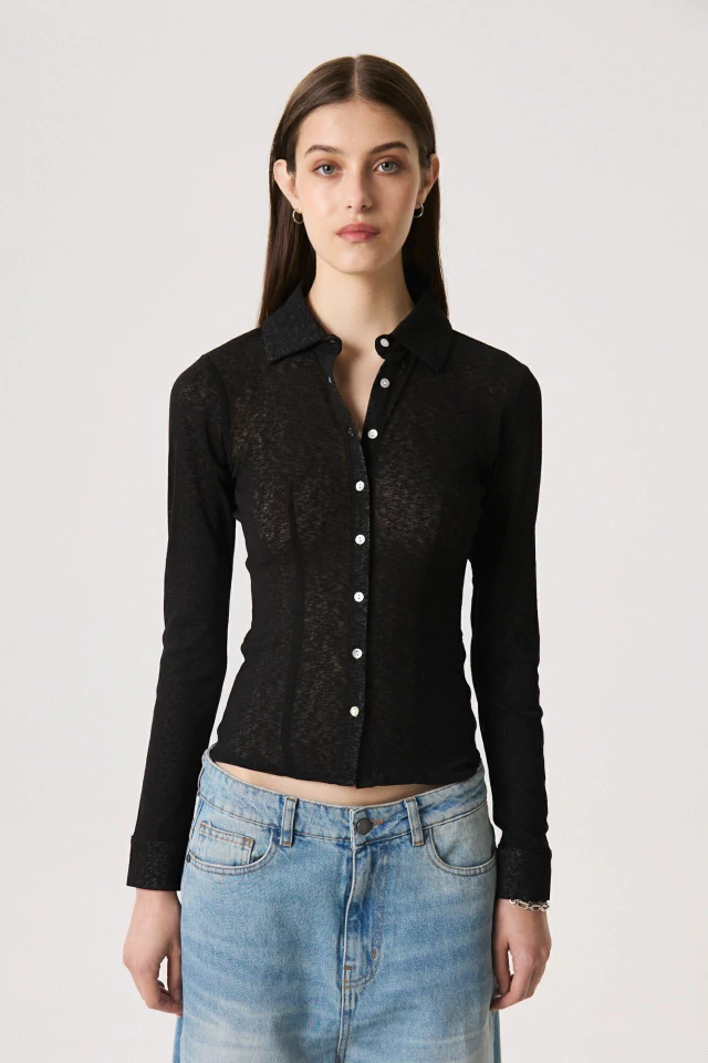 Camisa lisa con botones en delantero y puños. Silueta ajustada, largo debajo de la cintura.