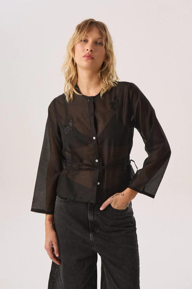 Camisa de tencel traslucido negro. Largo a primera cadera y silueta regular. Botones en delantero. Bordado en ambos delanteros. Lazo en cintura.Composicion: 85 tencel 15 poliester. Cuidados: Lavar a mano, con agua fria, secar a la sombra, no retorcer.