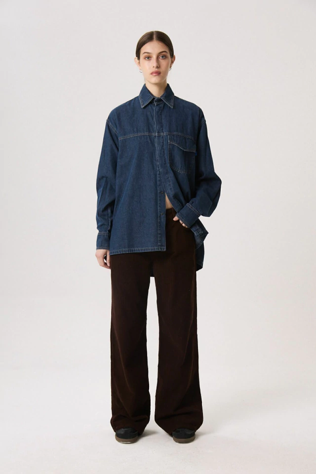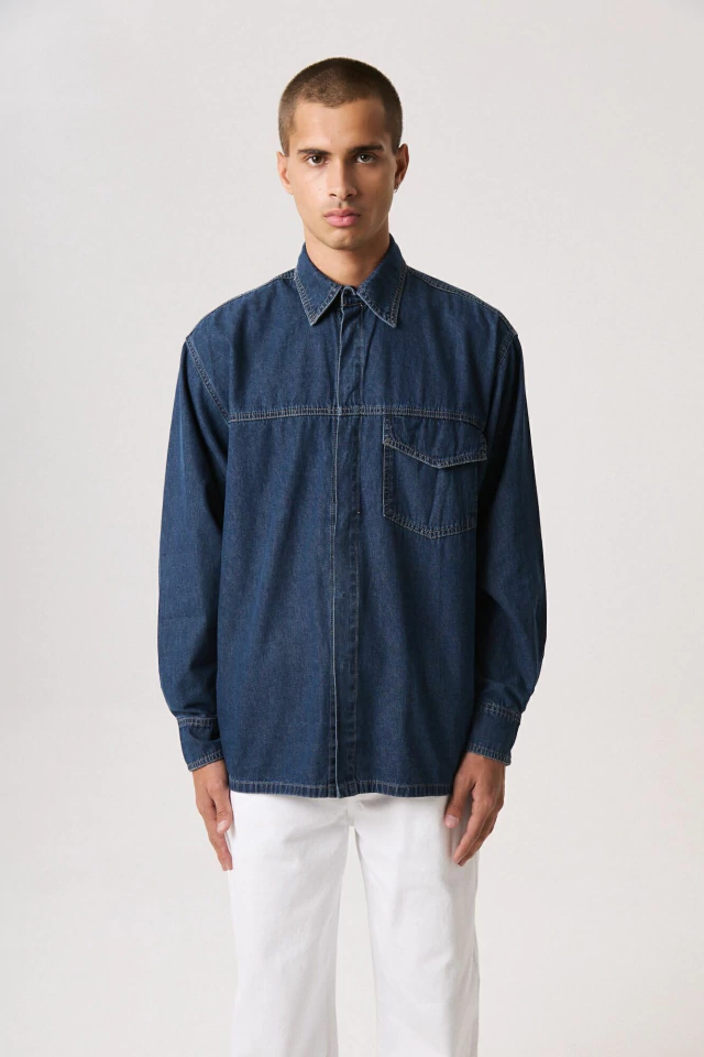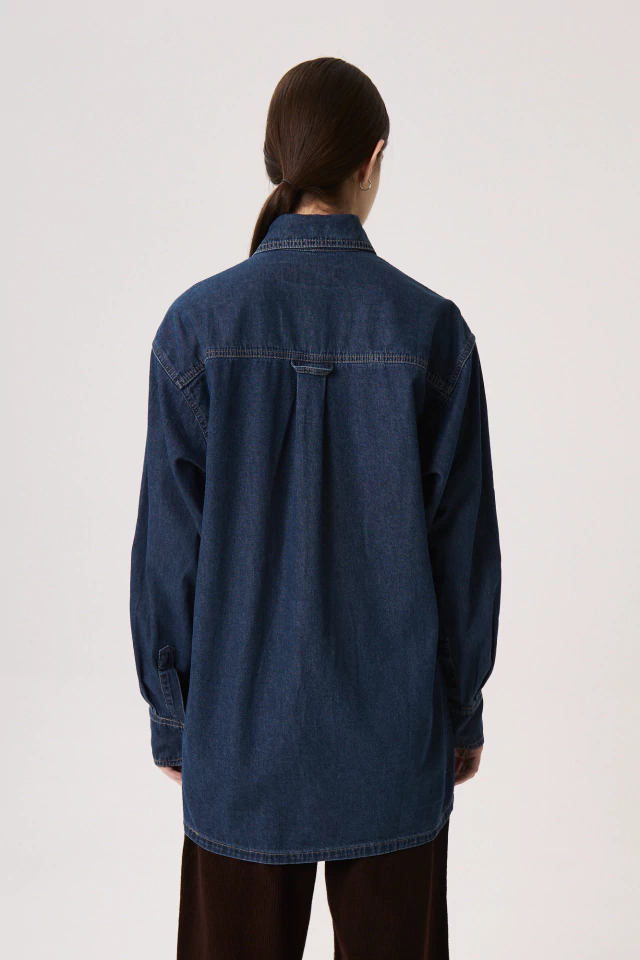 Camisa denim, azul oscuro con lavado sutil. Largo a segunda cadera, silueta amplia y relajada. Un bolsillo delantero. Botones en frente y puños. Lavado eco-wash con menor impacto ambiental: menos consumo de agua.