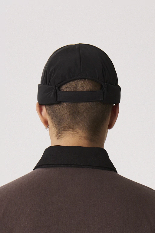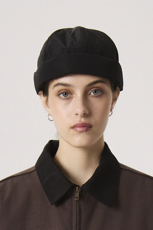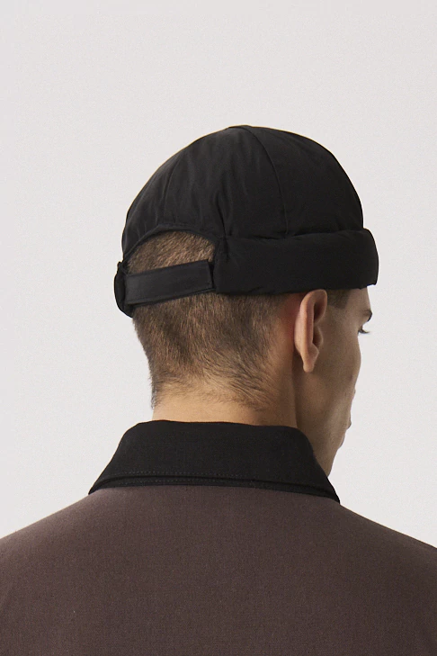 Gorro de ciré color negro. Calce ajustado, forrado y relleno en interior. Velcro para ajustar en parte trasera. Sin género. Composición: 100% poliester. Cuidados: Lavar a mano con agua fria. No Centrifugar. No usar blanqueador. Planchar maximo 110ºC.