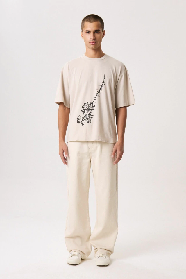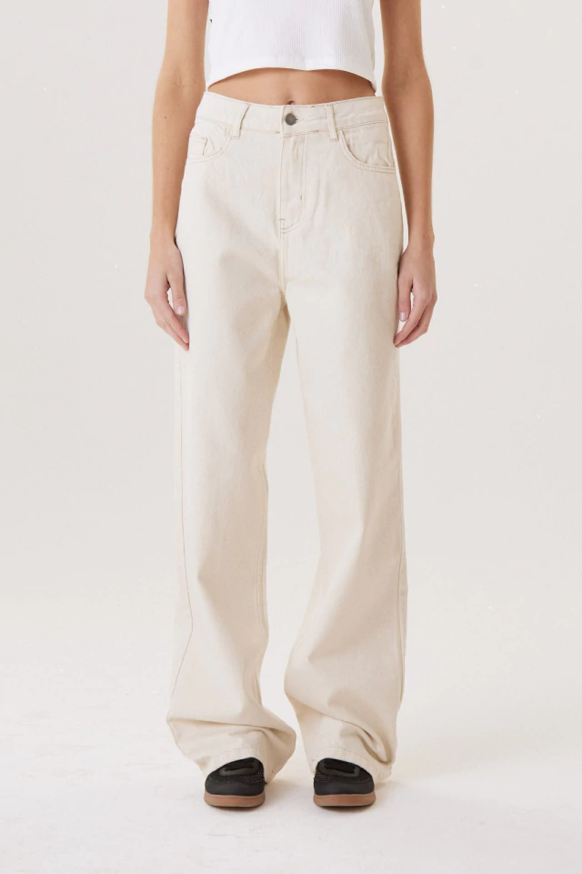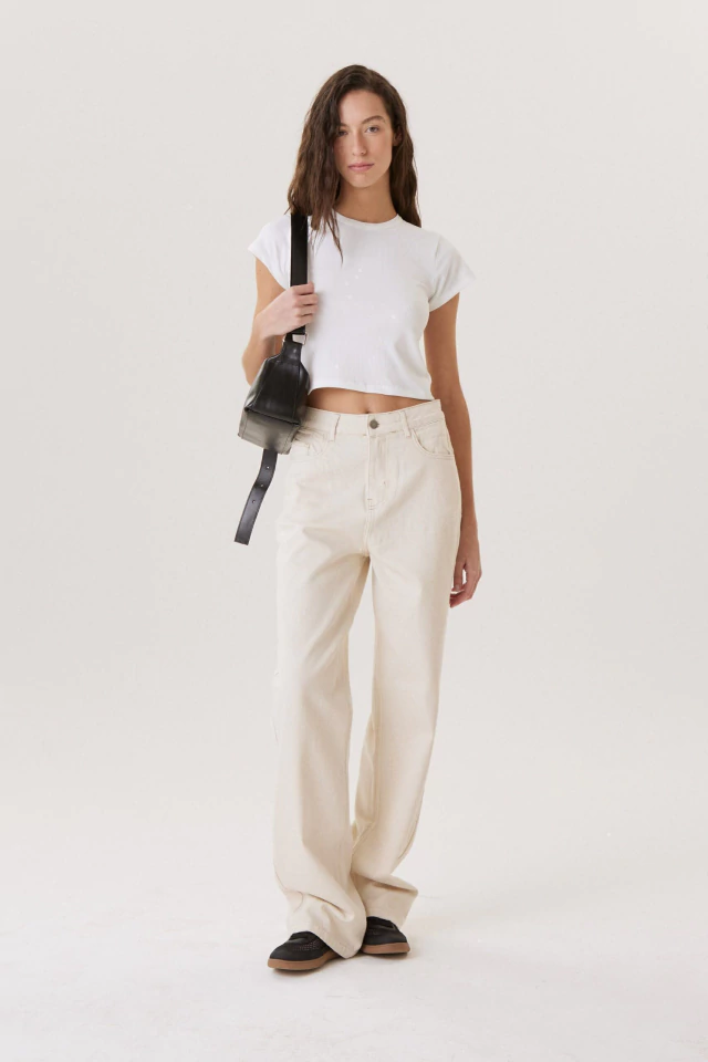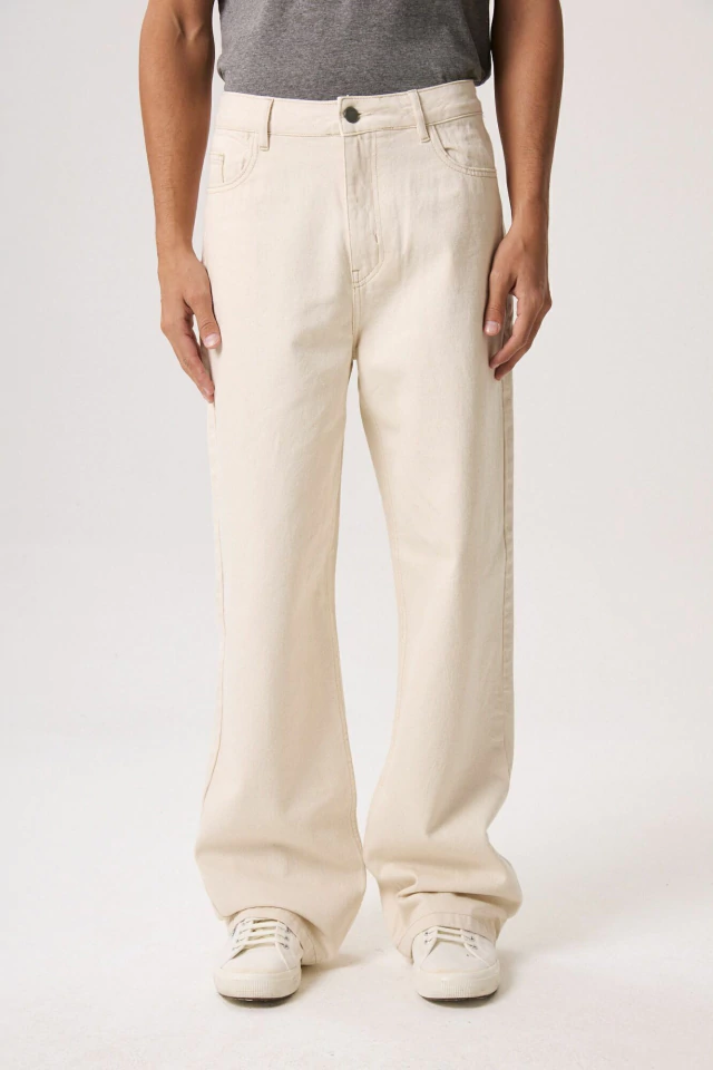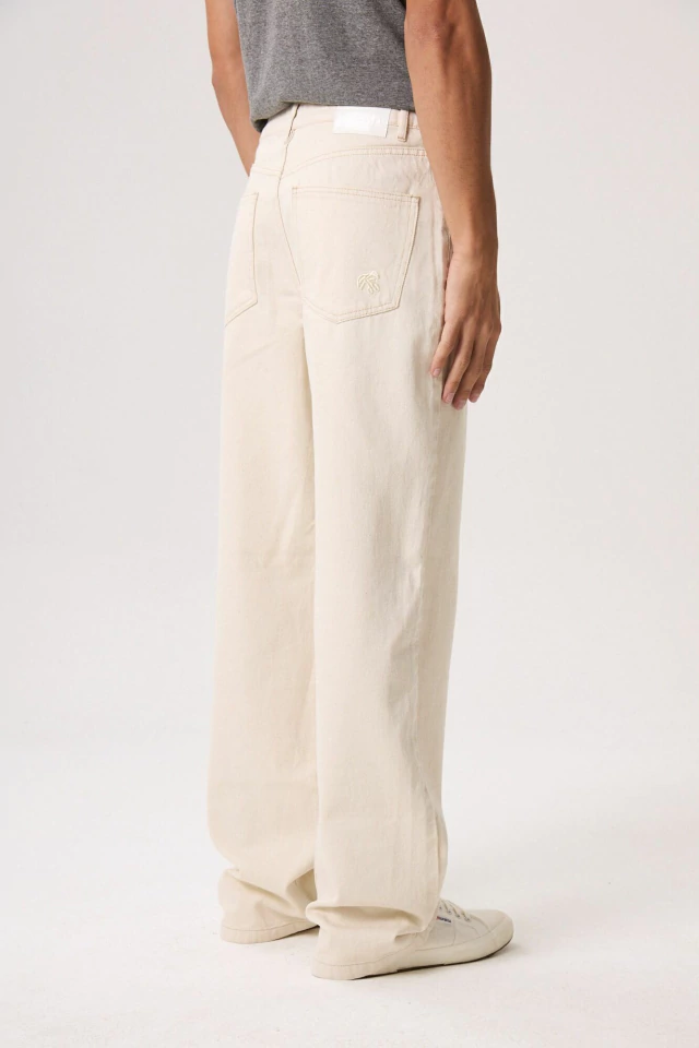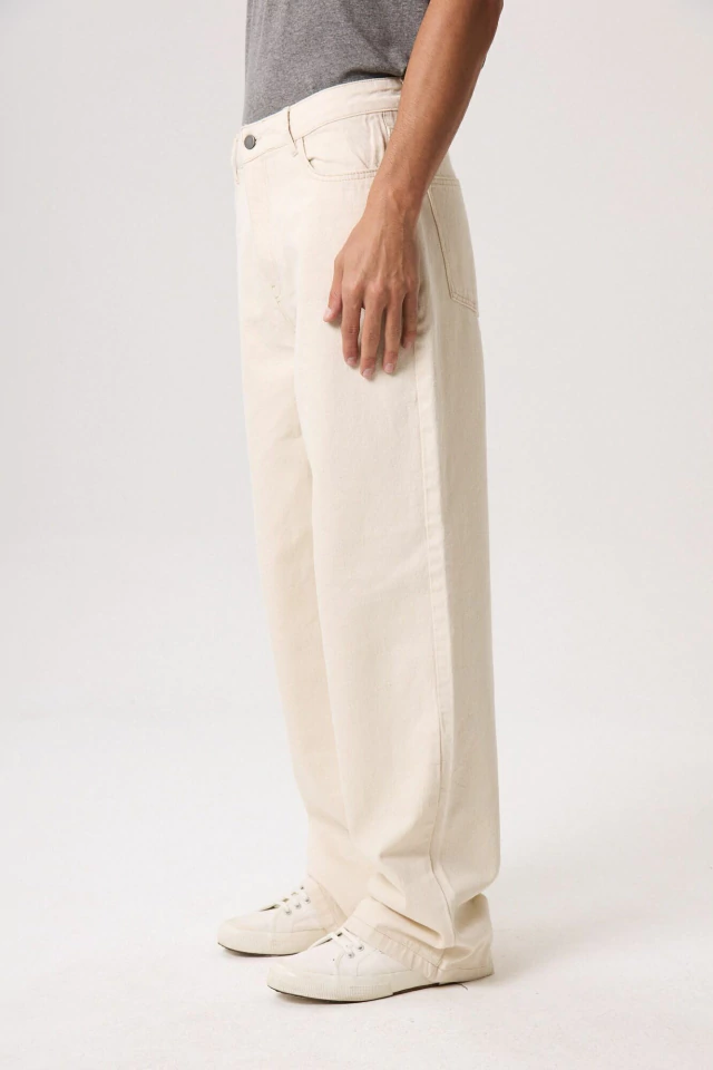 Tiro medio en cascarilla beige. Largo al piso, silueta relajada, con bordado en bolsillo trasero. Cierre frontal y avíos metálicos. Lavado eco-wash con menor impacto ambiental: menos consumo de agua y energía.