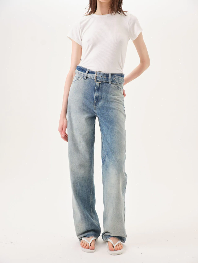 Tiro medio, color azul con efecto oxido. Calce relajado, pierna amplia. Largo al piso. Incluye cinturon de denim con hebilla metalica removible. Cierre frontal y avíos metálicos. Composición: 100% algodón. Cuidados: Lavar a máquina máx. 30ºC. Centrifugado corto. No usar blanqueador. Planchar maximo 110ºC.