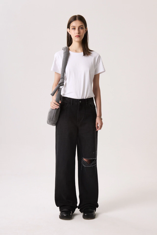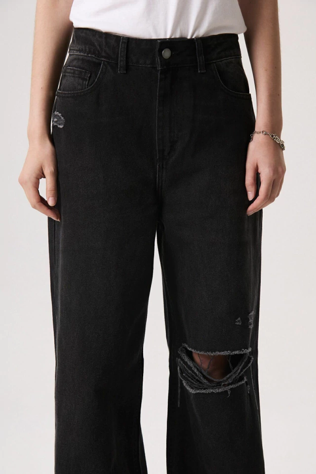Tiro alto negro, lavado sutil. Largo al piso, pata ancha con roturas. Cierre frontal y avíos metálicos. Lavado eco-wash con menor impacto ambiental: menos consumo de agua y energía.