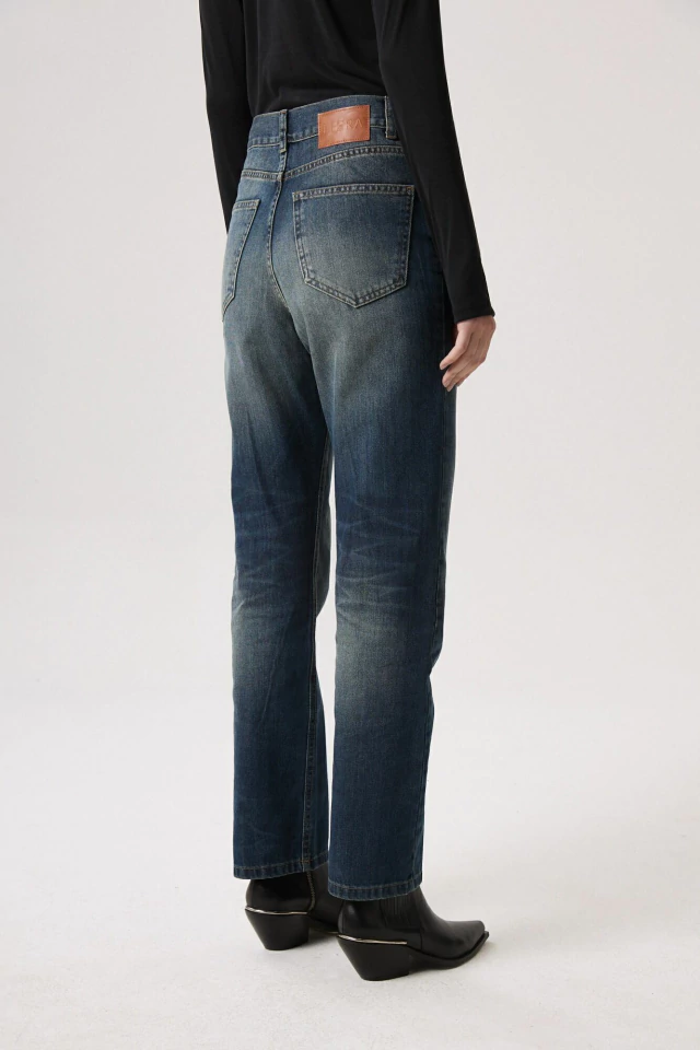Tiro alto, azul con efecto matiz. Largo a los tobillos, pata recta. Cierre frontal y avíos metálicos. Lavado eco-wash con menor impacto ambiental: menos consumo de agua y energía.