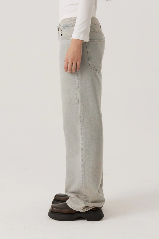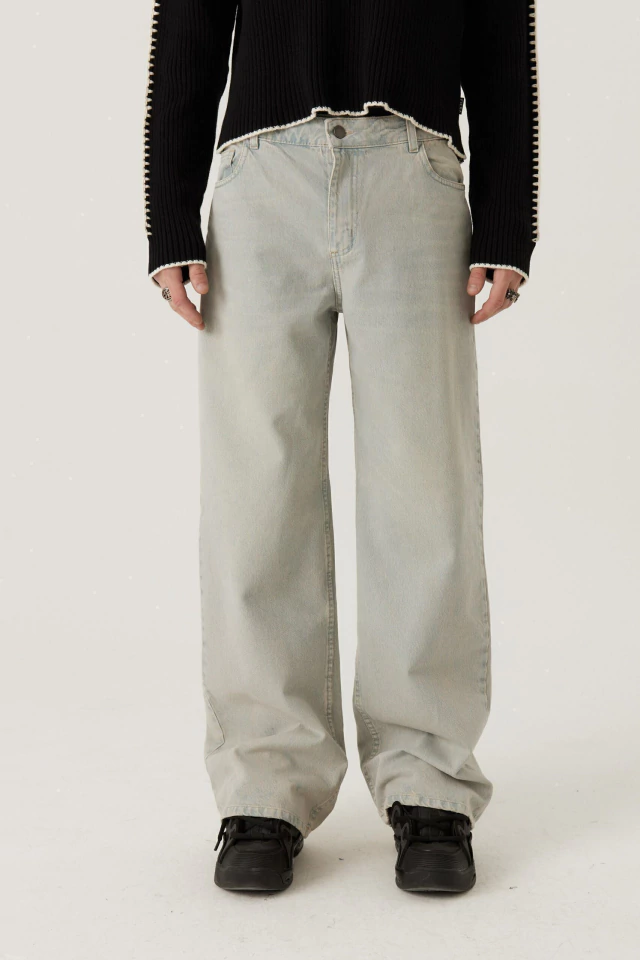 Tiro bajo, azul con lavado efecto erosionado. Largo al tobillo, silueta relajada con pierna amplia. Cierre frontal y avíos metálicos.