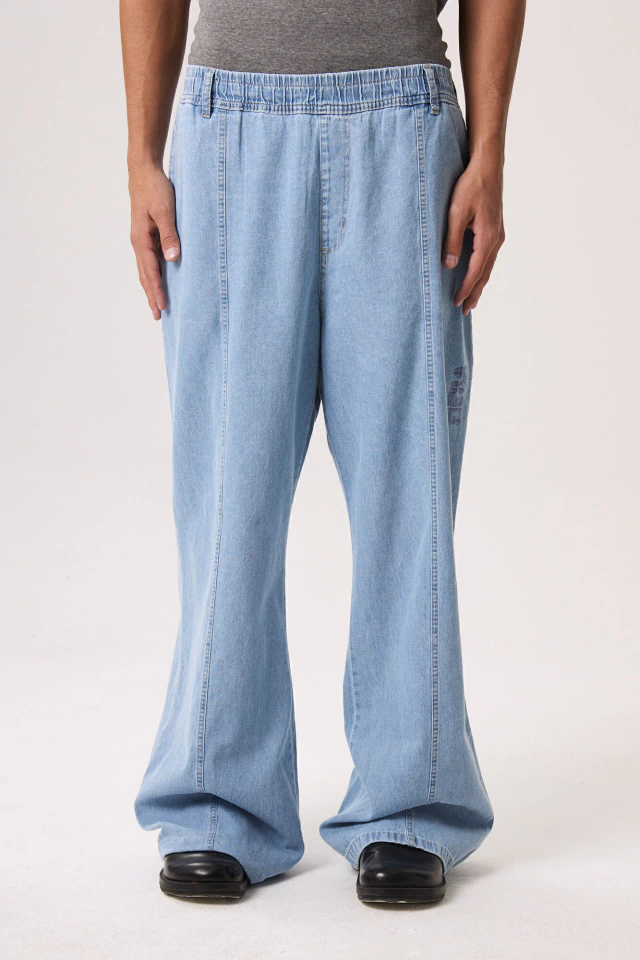 Tiro medio y largo, azul. Lavado sutil. Largo al piso, silueta muy amplia y relajada. Elastico en cintura y bolsillos laterales. Logo bordado en pierna izquierda. Lavado eco-wash con menor impacto ambiental: menos consumo de agua y energia. Composiciòn: 100 algodòn.Cuidados: Lavar en lavarropas, no usar blanqueador, centrifugado corto. Calce sin genero.