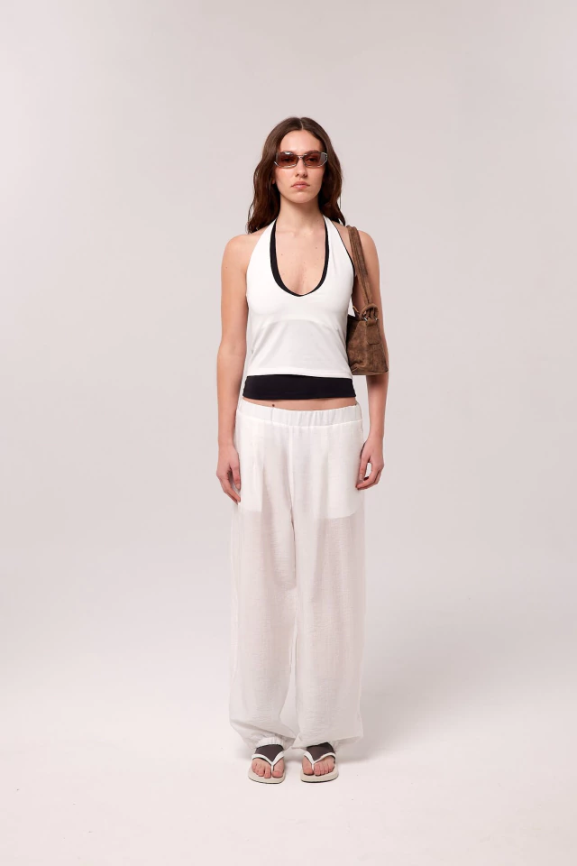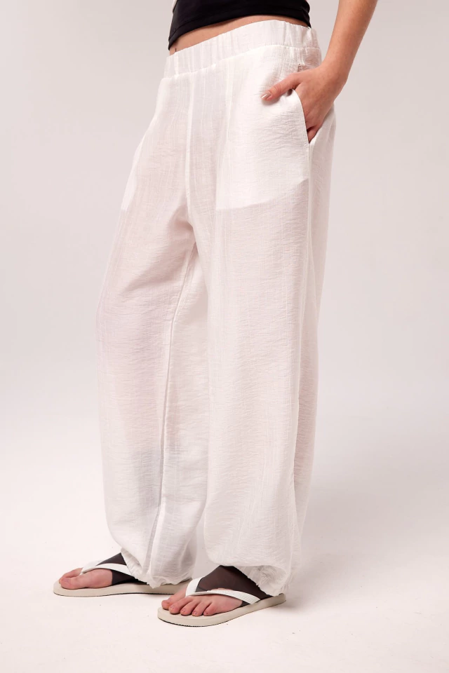 Pantalón color blanco, con efecto traslúcido. Largo al piso, piernas amplias con elastico en puños. Cordón de tela y elástico en cintura. Bolsillos laterales y traseros. Arma tu total look con el Vestido Viento. Composicion: 80% tencel 20% nylon. Cuidados: Lavar a mano con agua fria. No Centrifugar. No usar blanqueador. Planchar maximo 110ºC. Las medidas de la modelo son: Busto 82cm, Cintura 60cm, Cadera 90cm, Altura 1.75mt. Está usando talle S.