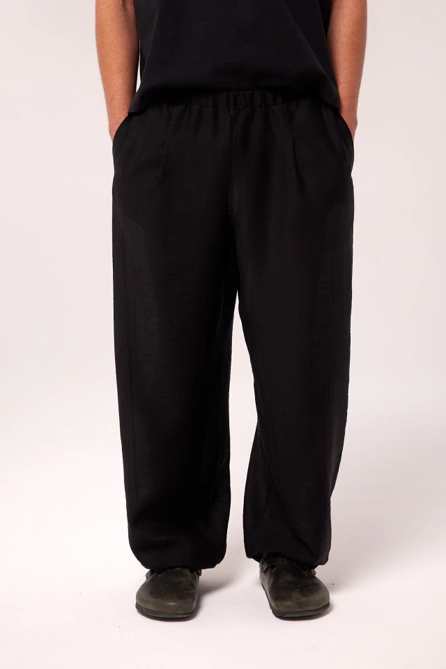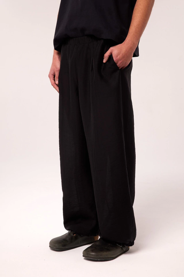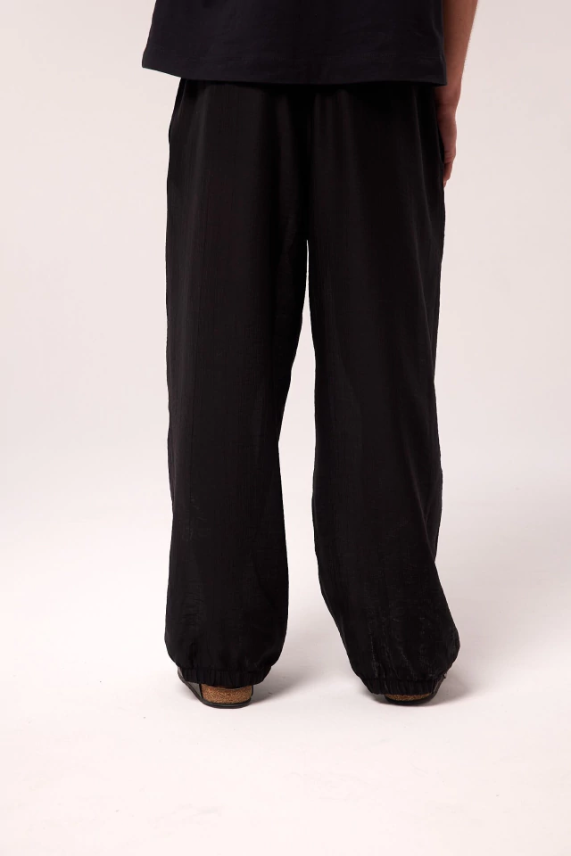 Pantalón color negro, con efecto traslúcido. Largo al piso, piernas amplias con elastico en puños. Cordón de tela y elástico en cintura. Bolsillos laterales y traseros. Arma tu total look con el Vestido Viento. Composicion: 80% tencel 20% nylon. Cuidados: Lavar a mano con agua fria. No Centrifugar. No usar blanqueador. Planchar maximo 110ºC. Las medidas de la modelo son: Busto 82cm, Cintura 60cm, Cadera 90cm, Altura 1.75mt. Está usando talle S.