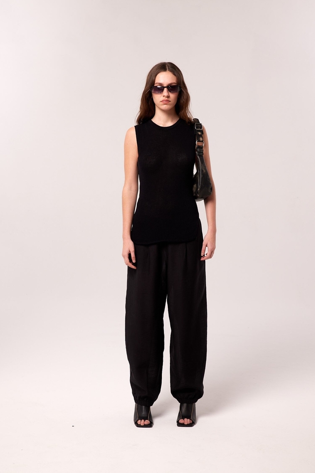 Pantalón color negro, con efecto traslúcido. Largo al piso, piernas amplias con elastico en puños. Cordón de tela y elástico en cintura. Bolsillos laterales y traseros. Arma tu total look con el Vestido Viento. Composicion: 80% tencel 20% nylon. Cuidados: Lavar a mano con agua fria. No Centrifugar. No usar blanqueador. Planchar maximo 110ºC.