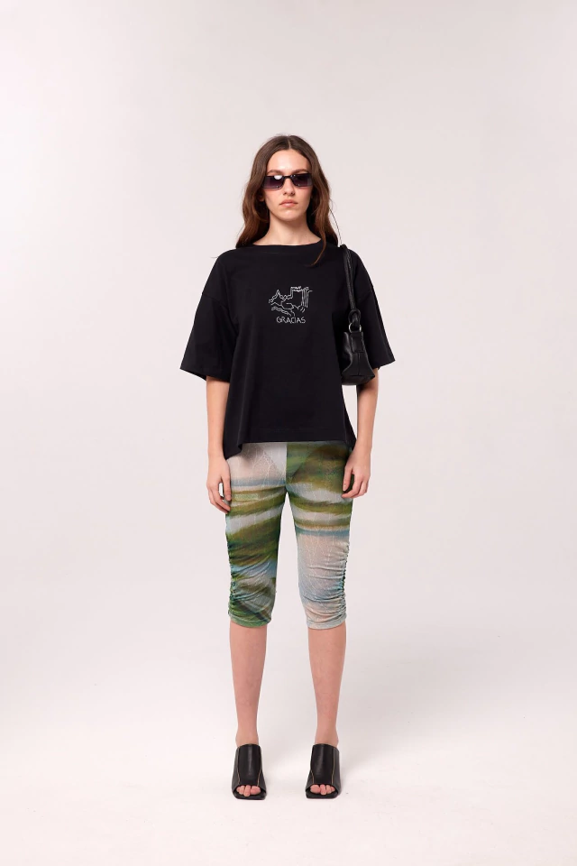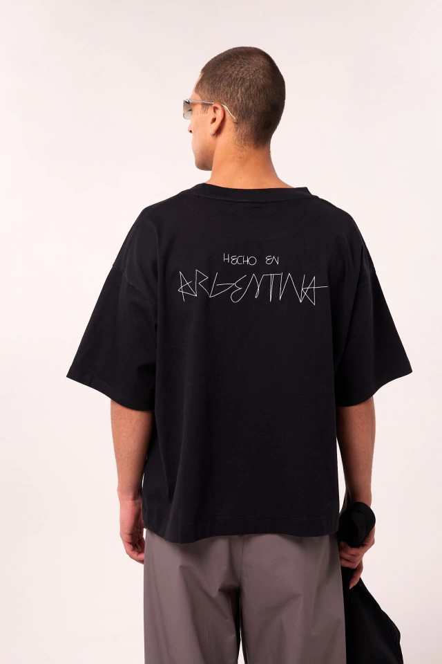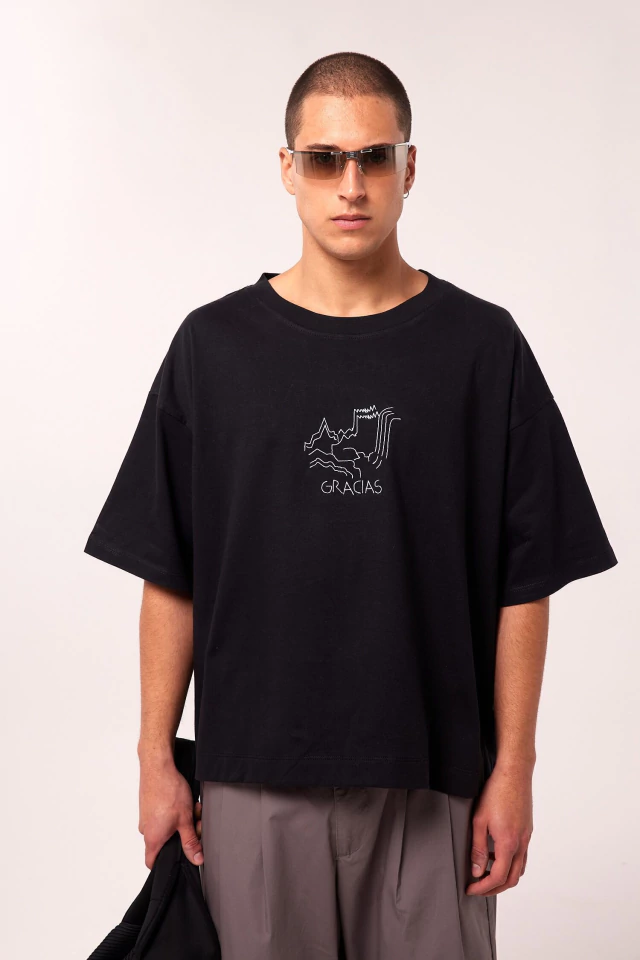 Remera manga corta color negro, con bordado en delantero y espalda. Largo a la primera cadera y silueta amplia. Composicion: 100% algodón. Cuidados: Lavar a mano con agua fria. No Centrifugar. No usar blanqueador. Planchar maximo 110ºC. Las medidas de la modelo son: Busto 82cm, Cintura 60cm, Cadera 90cm, Altura 1.75mt. Está usando talle S. Las medidas del modelo son: Busto 80cm, Cintura 74cm, Cadera 93cm, Altura 1.83mt. Está usando talle M.