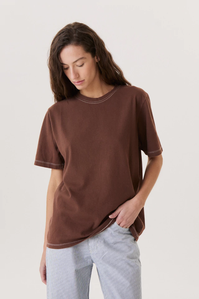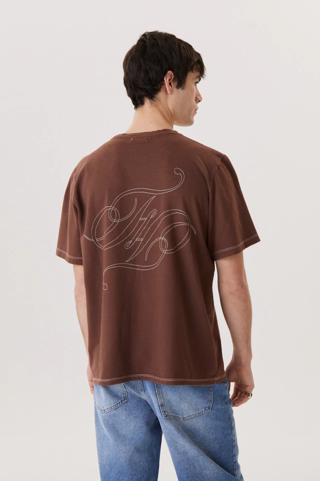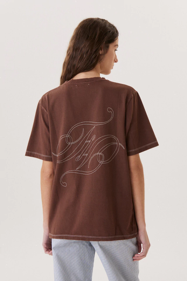 Remera teñida color marrón. Largo a segunda cadera y silueta amplia. Bordado en espalda. Costuras en color crudo.