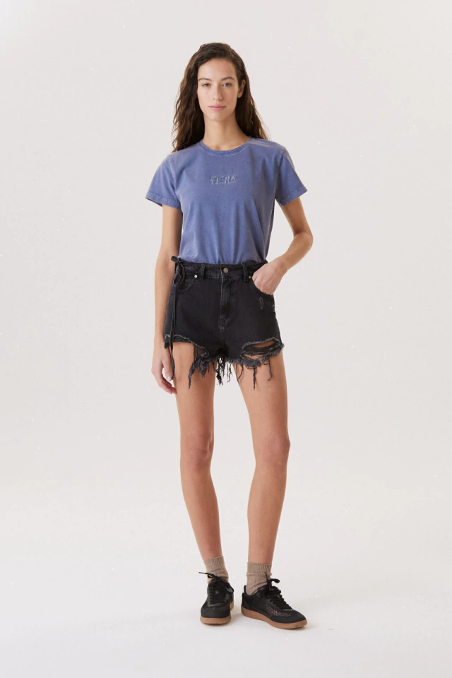 Short negro super corto, con rotura en ruedo. Lazo angosto en cintura. Cierre frontal y avíos metálicos. Lavado eco-wash con menor impacto ambiental: menos consumo de agua y energía.