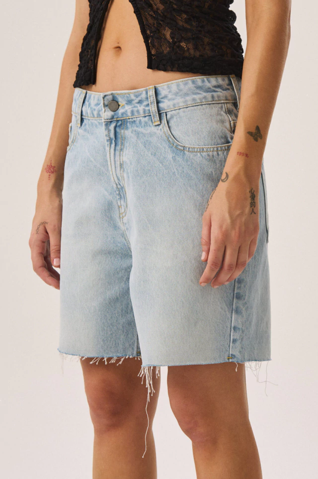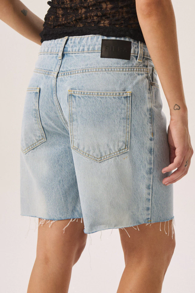 Short de tiro alto celeste. Largo encima de rodilas, pata recta. Cierre frontal y avíos metálicos. Lavado eco-wash con menor impacto ambiental: menos consumo de agua y energía. Composiciòn: 100 algodòn.Cuidados: Lavar en lavarropas, no usar blanqueador, centrifugado corto. Calce sin genero.