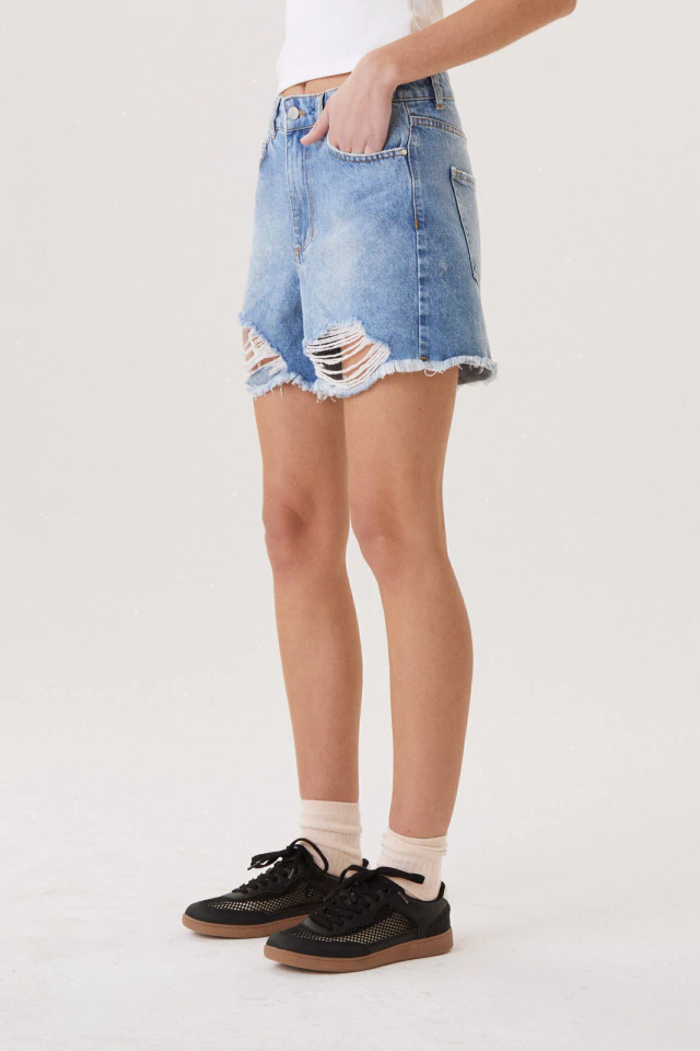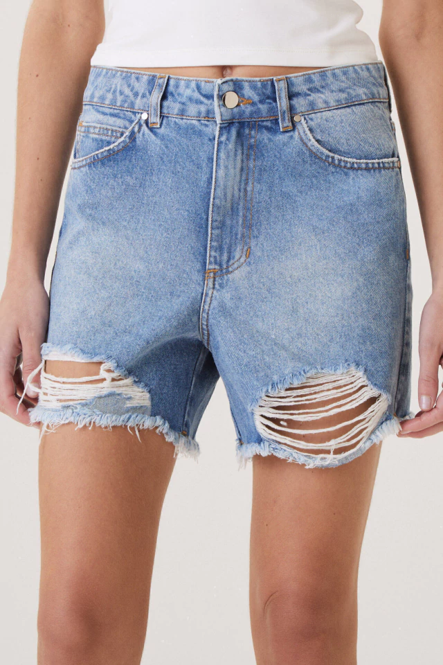 Bermuda de tiro alto azul gastado. Largo por encima de rodillas con rotura en ruedo, pata recta. Cierre frontal y avíos metálicos. Lavado eco-wash con menor impacto ambiental: menos consumo de agua y energía.