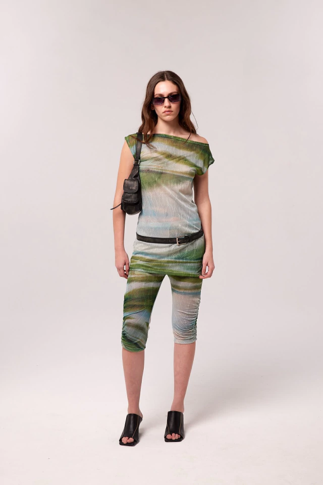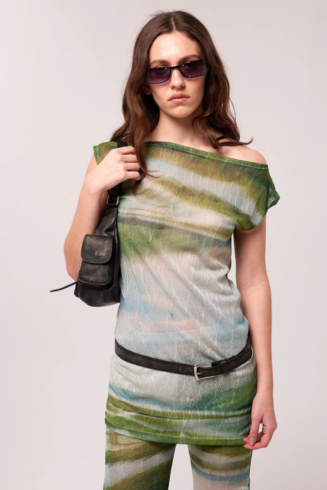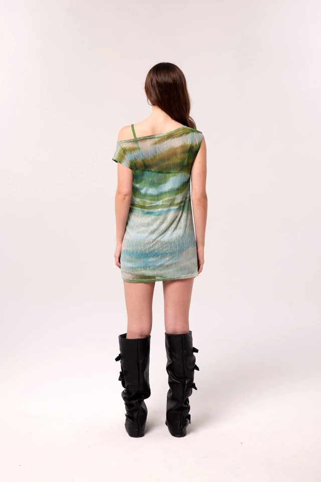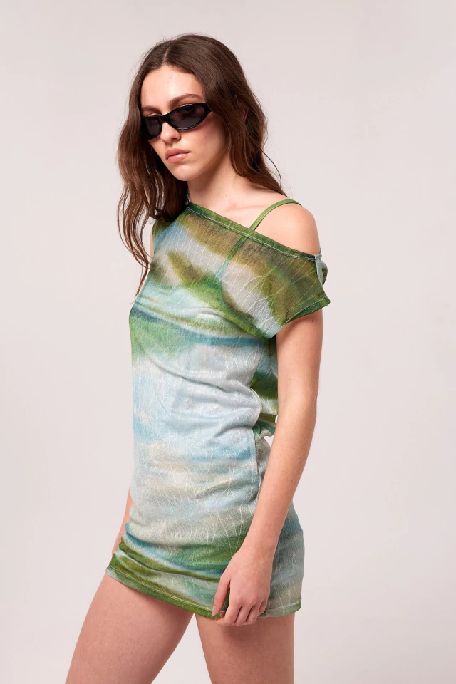 Vestido sin mangas estampado, con efecto traslúcido. Largo por encima de rodillas, silueta regular. Mangas asimètricas. Vestido interno desmontable de microfibra estampado. Composicion: 100% poliester. Composición forreria: 100% poliester. Cuidados: Lavar a mano con agua fria. No Centrifugar. No usar blanqueador. Planchar maximo 110ºC. Las medidas de la modelo son: Busto 82cm, Cintura 60cm, Cadera 90cm, Altura 1.75mt. Está usando talle S.