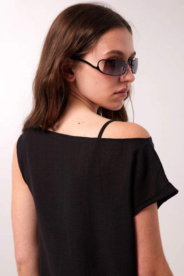 Vestido sin mangas color negro, con efecto traslúcido. Largo por encima de rodillas, silueta regular. Mangas asimetricas. Vestido interno desmontable de microfibra negro. Arma tu total look con el Pantalón Viento. Composicion: 80% tencel 20% nylon. Composición forreria: 100% poliester. Cuidados: Lavar a mano con agua fria. No Centrifugar. No usar blanqueador. Planchar maximo 110ºC. Las medidas de la modelo son: Busto 82cm, Cintura 60cm, Cadera 90cm, Altura 1.75mt. Está usando talle S.